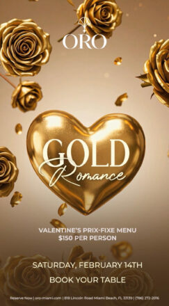 Miami Beach’s premier fine-dining destination, Oro, introduces “Gold Romance,” a Valentine’s Day prix-fixe experience designed for an elegant, indulgent evening. The menu opens with elevated bites such as cassava with scallion emulsion; and tuna nikkei with aji amarillo tiger milk; followed by smoked mushroom potstickers finished with truffle ponzu. Entrée selections include entrecôte au poivre with a gochugaru rub and charred broccolini; or grouper sake beurre blanc served with bok choy and pickled pearl onion. Desserts bring a romantic close with the chocolate brownie-forward Bella Rose or Forbidden Fruit.