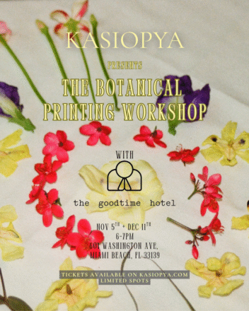 Join family- and women-owned slow fashion clothing line Kasiopya for a Botanical Printing Workshop on Thursday, December 11, from 6-7 p.m. at The Goodtime Hotel. Guests will enjoy a specially curated à la carte menu for purchase and a creative session where they will utilize locally grown and foraged plants to botanically print their own silk noil scarf or two silk charmeuse pocket squares. Guests will choose their botanical materials, learning about each plant’s unique properties, how to prepare and arrange them on the silk, and bundle wrap the item. The event will be held at The Restaurant at The Goodtime Hotel, which was inspired by the 1950s Riva wooden motorboat and the nostalgic charm of a retro Miami living room. The space features bleached wooden floors, turquoise grasscloth walls, fringed rattan furniture and scalloped bar stools. Tickets are $150, and discounted valet parking is available for $20. Tickets can be purchased HERE.