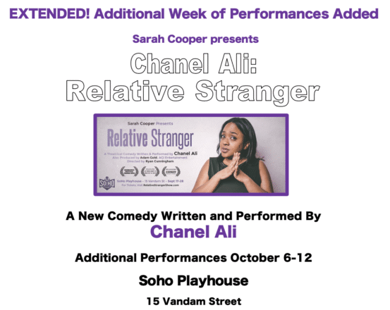 Due to popular demand, Chanel Ali: Relative Stranger has been extended for an additional week at Soho Playhouse (15 Vandam Street), now running through October 12. The groundbreaking comedy, about resilience, identity, and family secrets, opened September 28 and has garnered rave reviews.