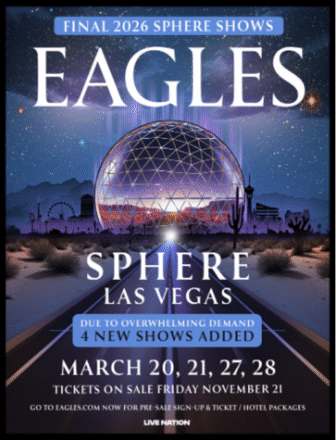 Final 2026 shows – Friday, March 20; Saturday, March 21; Friday, March 27; and Saturday, March 28 – have been added to EAGLES – LIVE IN CONCERT AT SPHERE, the longest-running residency at the revolutionary venue with 56 shows in total. To date, the residency has attracted more than 700k fans across 44 sold-out shows since September 20, 2024, offering fans the ultimate connection to the band’s legendary catalog in an immersive experience that only Sphere can provide. The general on-sale for the final 2026 showswill begin Friday, November 21 at 10:00 AM PT at https://ticketmaster.com
