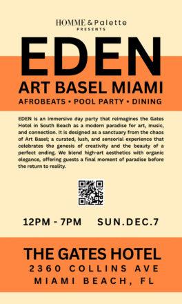 On Sunday, December 7, from noon to 7 p.m., The Gates Hotel South Beach and HOMME & Palette by Chicago-born painter and NFT innovator Tuan Jones present EDEN, an immersive party and art exhibition that reimagines the property as a modern paradise for art, music and connection. Designed as a sanctuary from the chaos of Miami Art Week, EDEN offers a curated, lush and sensorial experience that celebrates the genesis of creativity and the beauty of a perfect end, blending high-art aesthetics with organic elegance. With an intimate Artists and Collectors Brunch from 11 a.m. to 2 p.m., the gathering is designed to spark meaningful connections between emerging artists and established collectors. For those who cannot attend the event, the exhibition will be available for viewing from December 4-15, featuring works by EDEN Creative Director Tuan Jones, alongside Detroit-based artist Bandy Lee, whose work fuses pop culture, streetwear and Web3. To purchase tickets, click HERE. To learn more about all of The Gates’ Miami Art Week events and purchase tickets, visit HERE.
