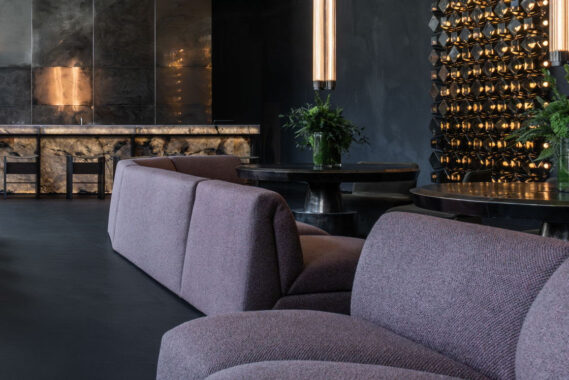 The refined setting features sharp geometries, warm materials, modular seating, and dramatic details like a violet quartzite bar counter and Murano glass lighting. Pale gold metal walls and theatrical pendant lights reflect natural light, creating an atmosphere of intimacy and power. The lounge embodies contemporary elegance, balancing strength and softness through luxurious textures and mineral contrasts.