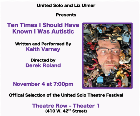 Keith Varney, writer and performer of Ten Times I Should Have Known I Was Autistic, will present his compelling one-man play at Theater Row’s Stage 1 on November 4, as part of the United Solo Theatre Festival. The show, directed by Derek Roland, features Varney’s candid and humorous recounting of his journey discovering he is autistic—an awakening that reshapes his understanding of his childhood and adult life.