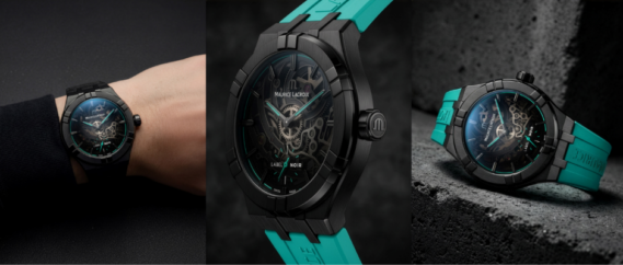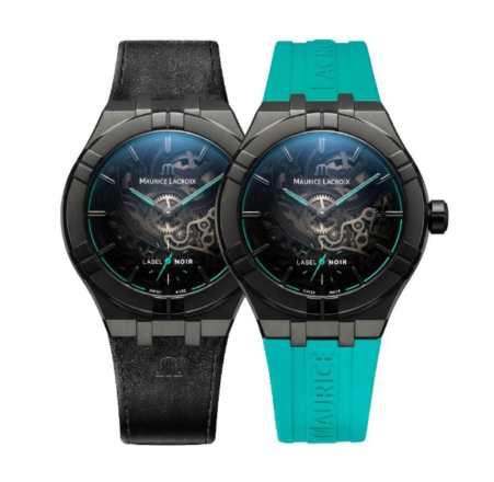Responding to customer demand, Maurice Lacroix teams up with Geneva-based Label Noir for a third exclusive timepiece. Limited to just 100 pieces, the AIKON Automatic Label Noir combines the iconic urban style of the AIKON collection with a striking black DLC case, refined skeletonized movement, and vivid turquoise accents.
