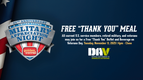 Celebrating a quarter-century of support, Golden Corral also partners with Disabled American Veterans (DAV), raising funds locally to assist disabled veterans and their families. Since 2001, the chain has given nearly 6.7 million free meals nationwide.