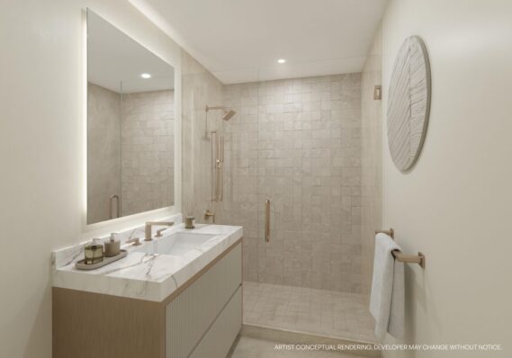 Designed by Revuelta Architecture International with interiors designed by Adriana Hoyos Design Studio, 7200 Collins features 222 fully furnished residences ranging from junior one-bedrooms to two-bedroom layouts with a den. Each unit comes with elegant porcelain flooring throughout, private terraces that seamlessly blend indoor and outdoor living through sliding glass doors, and spacious closets. Kitchens come with Italian-inspired custom cabinetry designed by Italkraft, sleek, modern slab countertops with a matching backsplash, Grohe black sink faucets and a stainless steel undermount sink, and Bosch appliances. Bathrooms feature porcelain-tiled showers with glass enclosures and Grohe brass-finished showerheads, Grohe sink faucets with vanity sink basins, and Grohe dual flush toilets, and select units house bathtubs with brass fixtures.