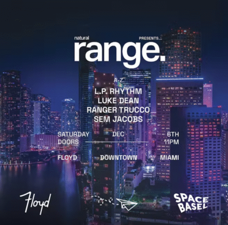 On December 6, from 11 p.m., Floyd Miami (34 NE 11th St suite b) hosts Range. featuring performances by Ranger Trucco, L.P. Rhythm, Luke Dean, and Sem Jacobs.