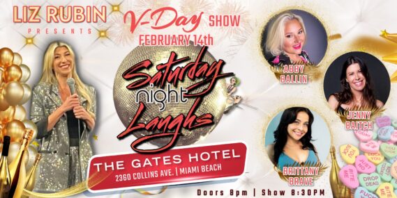 Saturday Night Laughs returns to The Gates Hotel South Beach on Saturday, February 14, from 8:30-10 p.m., bringing the SNL vibe to Miami with host and producer Liz Rubin, a veteran stand-up comedian with 15+ years of experience who has shared the stage with Jerry Seinfeld and Jim Gaffigan. The evening is headlined by Brittany Brave, a New York City–based comedian, actress, producer and host known for her high-energy, unapologetic comedic style. Originally from Miami, Brave has built a bicoastal career and earned accolades, including Best Comedy Act from Time Out Miami(2023) and Best Comedian from the Miami New Times (2021). Also featured is Abby Ballin, a South Florida-based comedian and producer known for her raw, autobiographical comedy, along with Jenny Baitch, a South Florida stand-up comedian and humorist. This 21+ event promises non-stop laughs in an intimate hotel setting with complimentary tastings from Aguasol Tequila. Paid parking is available at the venue. General admission is $25. Reserve your seat now on Eventbrite.