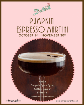 Everyone’s favorite cocktail just got a fall twist at Delilah Miami, known for its technique-driven dishes and vintage, celebrity-frequented atmosphere. Available throughout the fall season, the Pumpkin Espresso Martini ($21) is made with vodka, pumpkin-spice syrup, coffee liqueur and espresso, all topped with espresso beans. Sip on the festive cocktail in the stylish indoor dining room or alfresco via the restaurant’s waterfront patio offering panoramic views of Biscayne Bay.