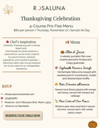 Celebrate Thanksgiving with an Italian twist at Rosaluna! Join us for a refined, seasonal four-course menu crafted by Chef Daniele De Santis, featuring autumn flavors, artisanal ingredients, and heartfelt hospitality. Experience an unforgettable table-side course prepared live, bringing a unique touch to your holiday gathering.