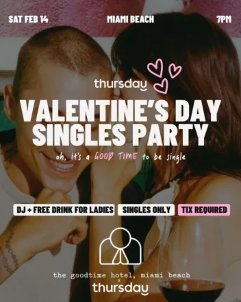 Join Thursday Dating at The Goodtime Hotel on Saturday, February 14 from 7 p.m. to midnight for Florida’s most unforgettable Valentine’s celebration for singles. Ride the elevator to the third floor and step into a world designed for connection, featuring over 175 single guests, with music flowing through the space for an evening that lasts until the lights come on, or until you find yourself leaving hand in hand with someone special. Guests will enjoy Valentine’s themed cocktails and bites created exclusively for the holiday, along with one complimentary drink for the first 100 ladies through the door from The Restaurant at The Goodtime Hotel. The night sets the mood with a live DJ and a carefully curated 50/50 gender ratio. The 21+ event offers happy hour pricing throughout the night. Early-bird tickets are $15 and general admission are $20. Grab your spot HERE.