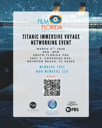 Enjoy light F&B, network with industry professionals, and enjoy a wonderful exhibit featuring numerous artifacts, never-before-seen 3D views, video animations, and cutting-edge technology, Titanic: An Immersive Voyage tells the story of the RMS Titanic like never before. Space is extremely limited for this event, don’t wait to register. Tickets are $20 per person, FREE for Film Florida members, email info@FilmFlorida.org for code.